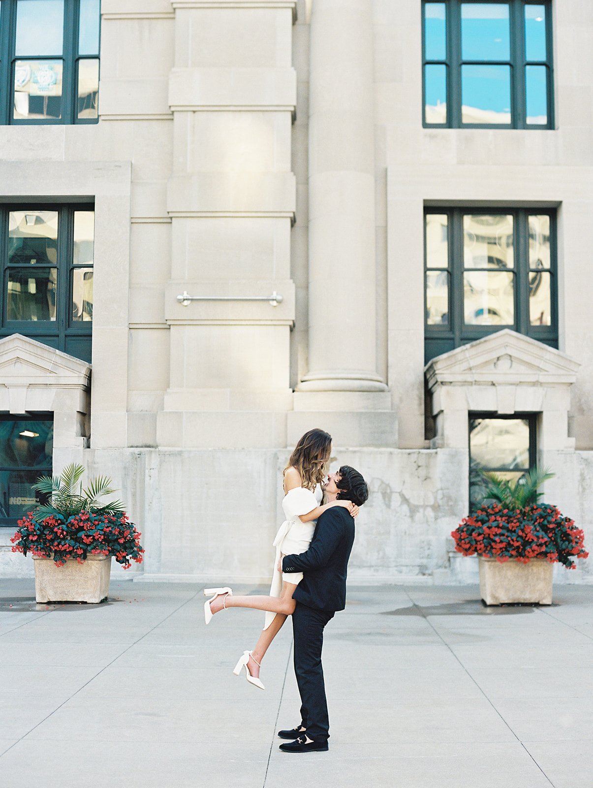 These historical landmarks, with their timelessness and architectural charm, painted the perfect backdrop for their portraits. With the Liberty Memorial Tower in the background we began their session in a classic white satin dress with a bow and puffed sleeves, heels with pearls a black suit. Morgan and Matt crafted timeless looks that will last the test of time.
