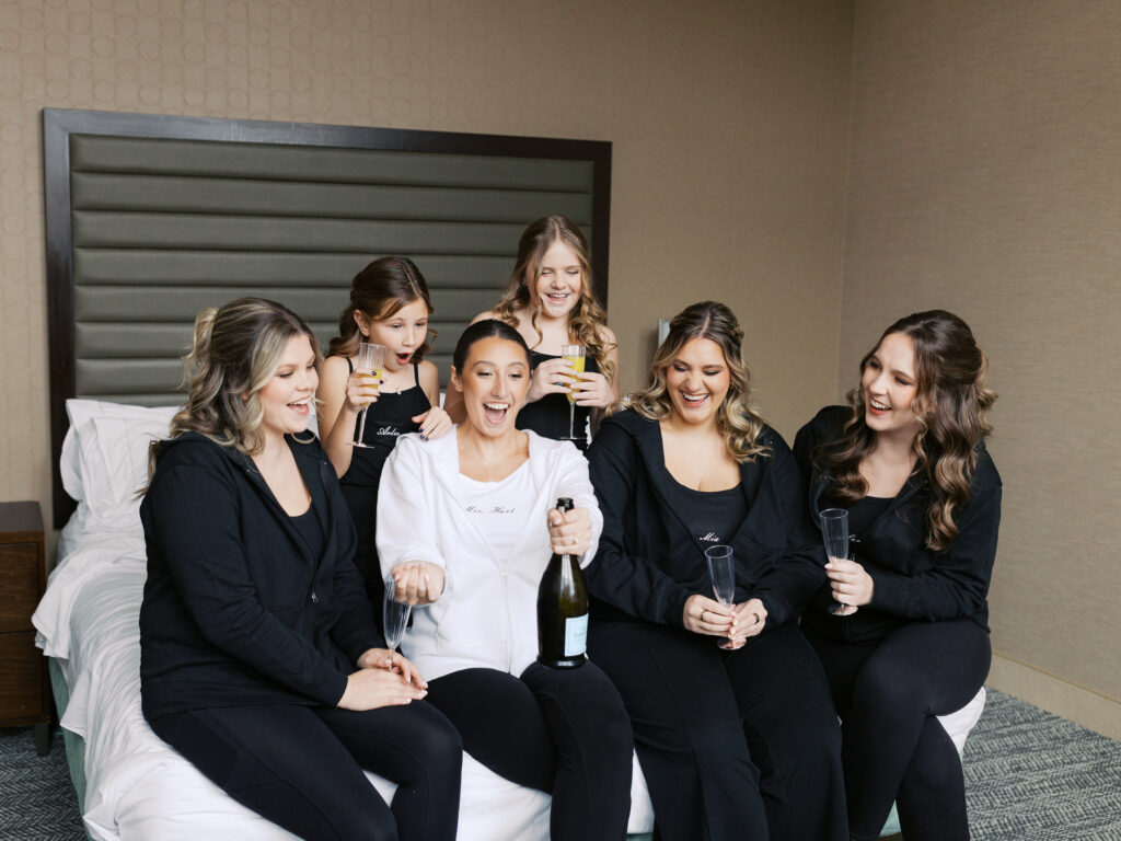 The day began at the Embassy Suites in downtown St. Louis, where Maggie and her bridesmaids prepared surrounded by love, laughter, and anticipation. Personalized touches set the tone for the morning: a handwritten letter from Jared to each bridesmaid, soft candlelight, and the wedding invitation suite carefully styled for photography.
