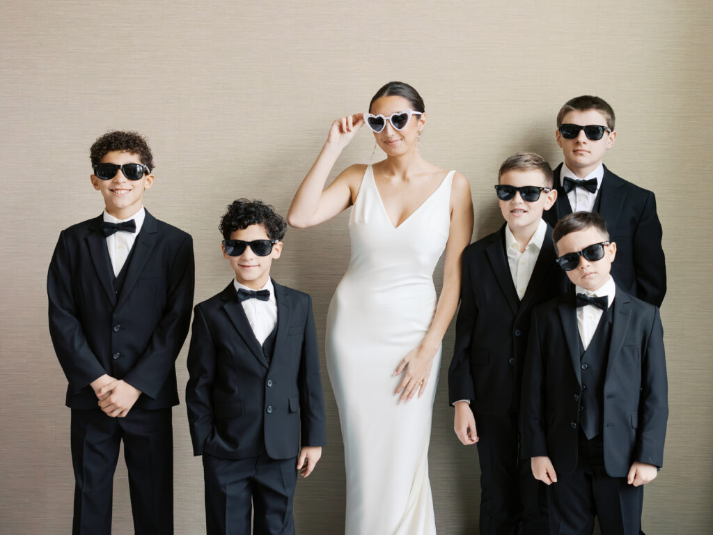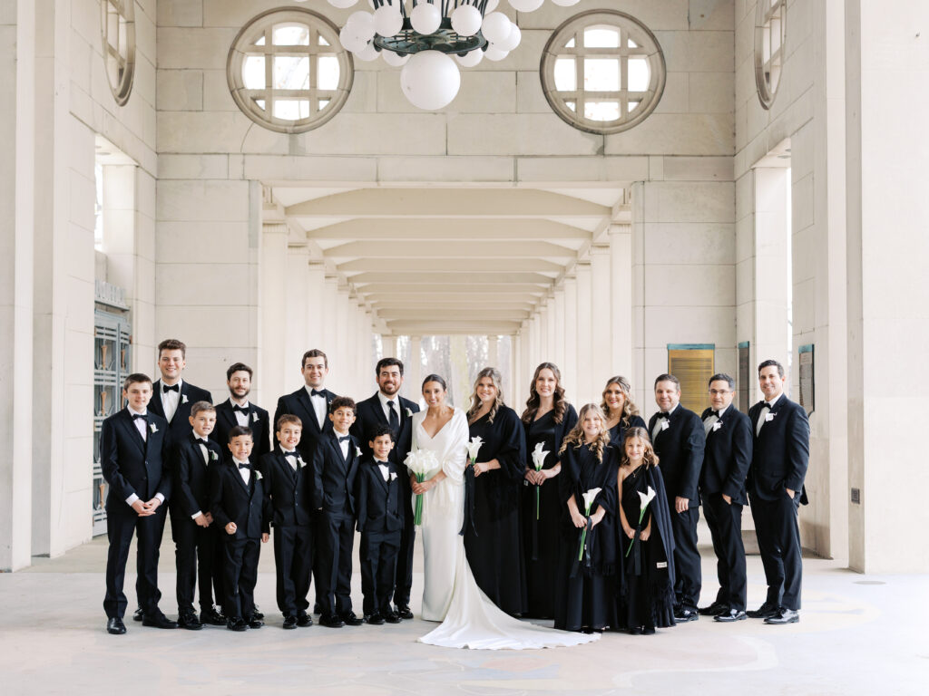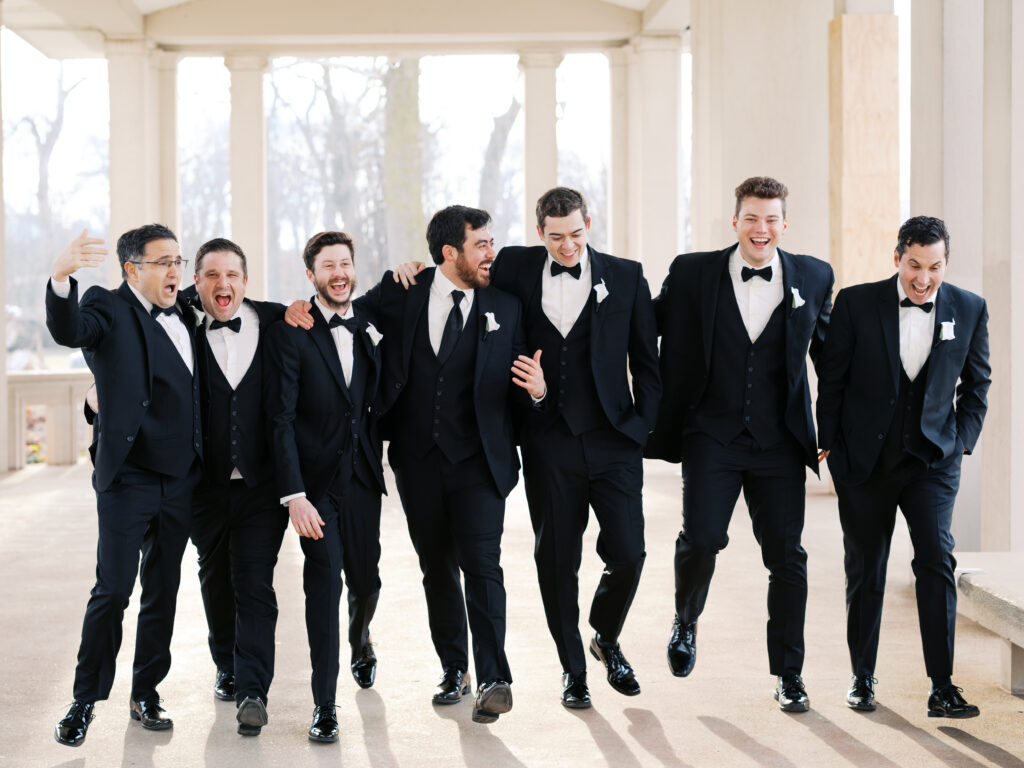 From downtown, we headed to the Municipal Theatre, otherwise known as The Muny, one of St. Louis’s most iconic locations for wedding portraits. The stone architecture provided the perfect backdrop for STL wedding photographers to capture classic, refined imagery. The wedding party portraits were full of movement, laughter, and personality, reflecting Maggie and Jared’s fun-loving energy while keeping the portraits bright and timeless.