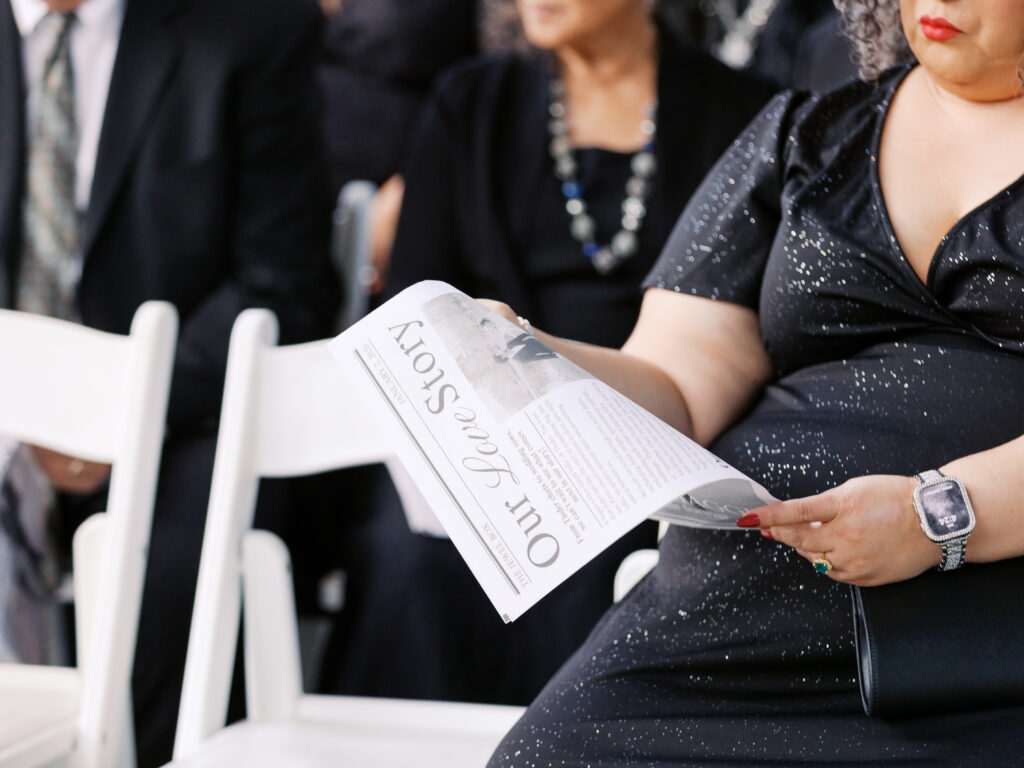 Candles lined the ceremony space, creating warmth and contrast against the winter light outside. Guests participated in traditions that made the day uniquely Maggie and Jared’s: a book filled with letters from family and friends, newspapers chronicling their love story, and a custom trunk to store keepsakes from their day.