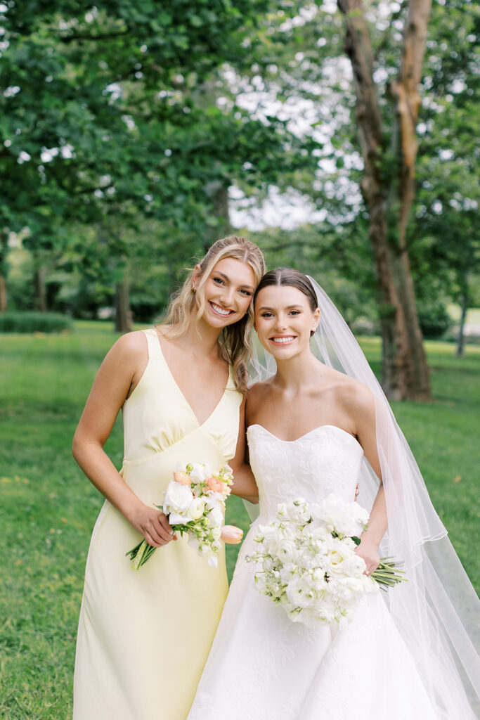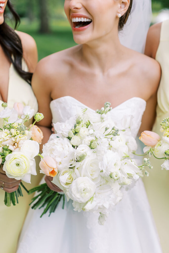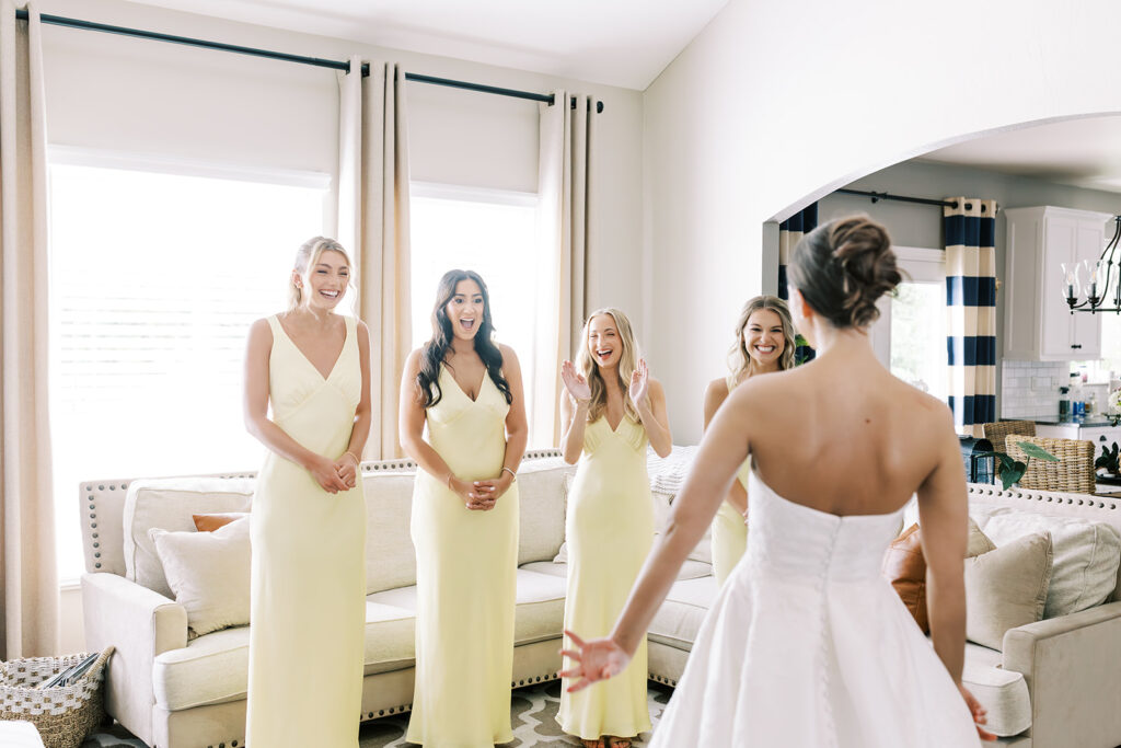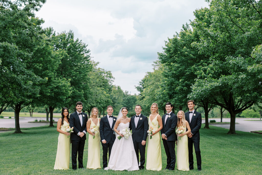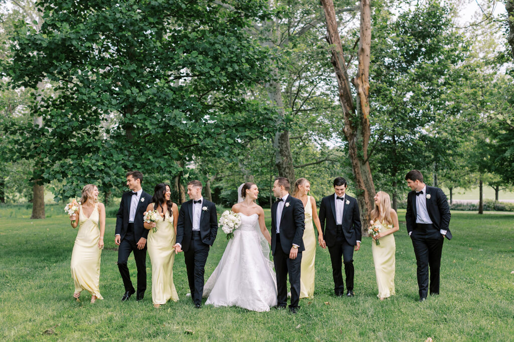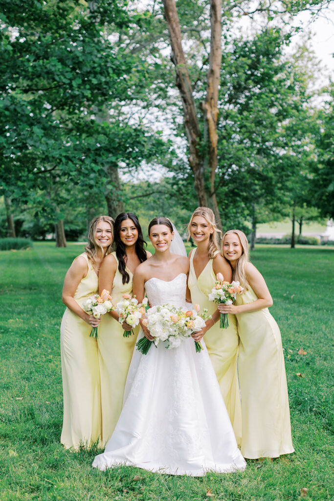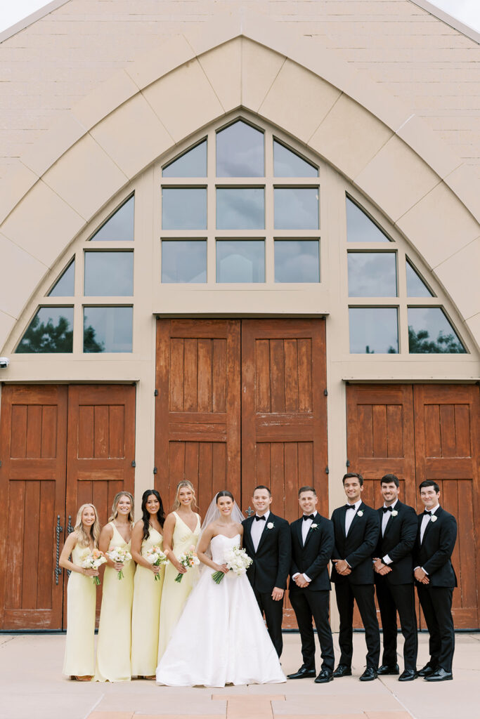 Her bridesmaids wore soft butter yellow dresses that immediately set the tone for the wedding’s color palette. The combination of butter yellow with black and white details felt classic and fresh — bright enough for spring while still elegant.