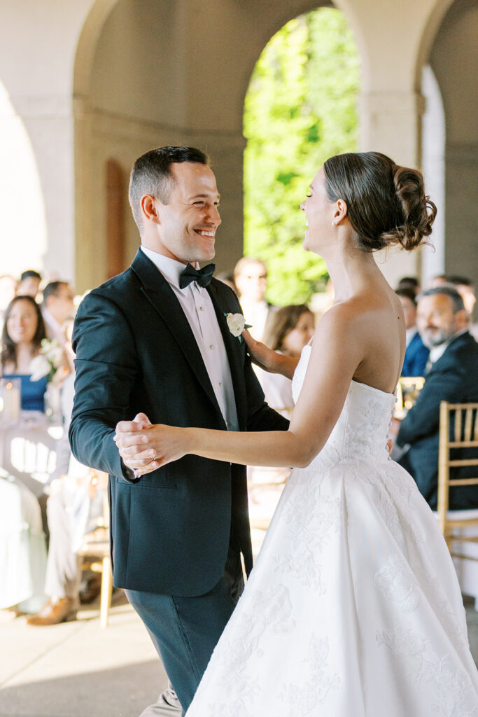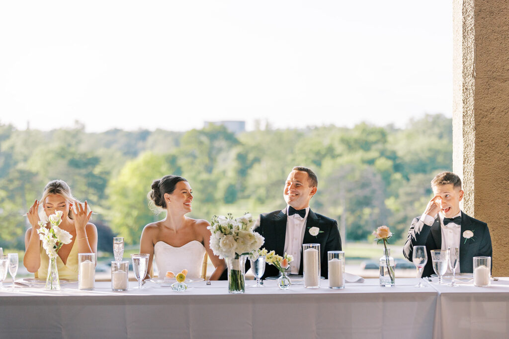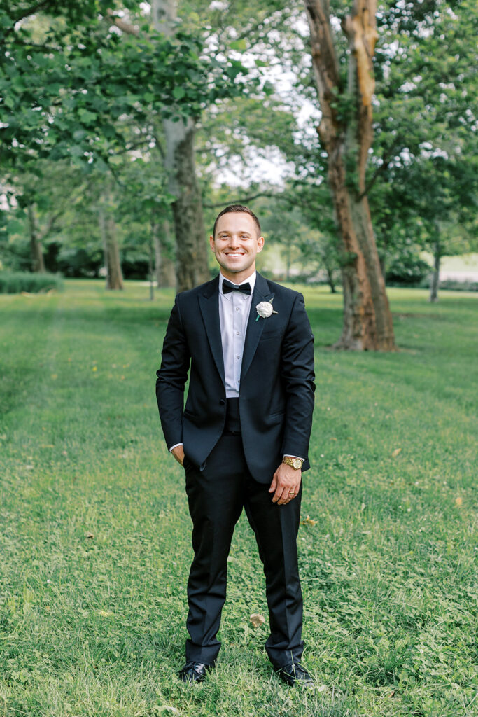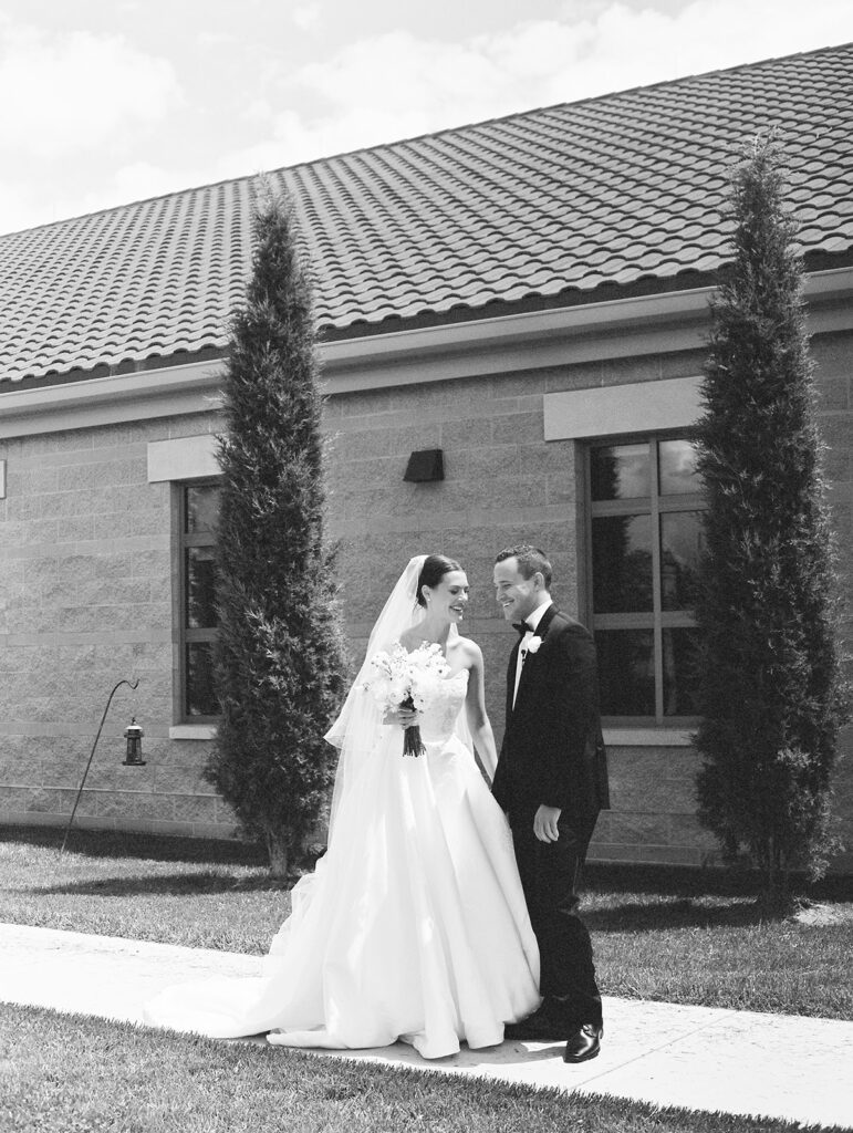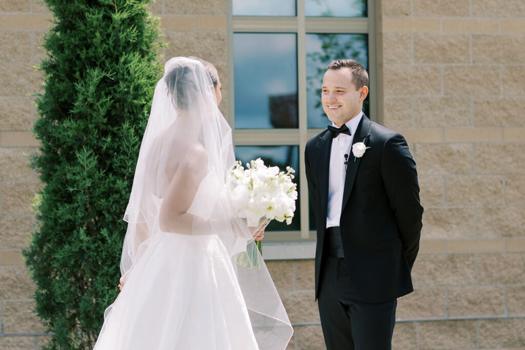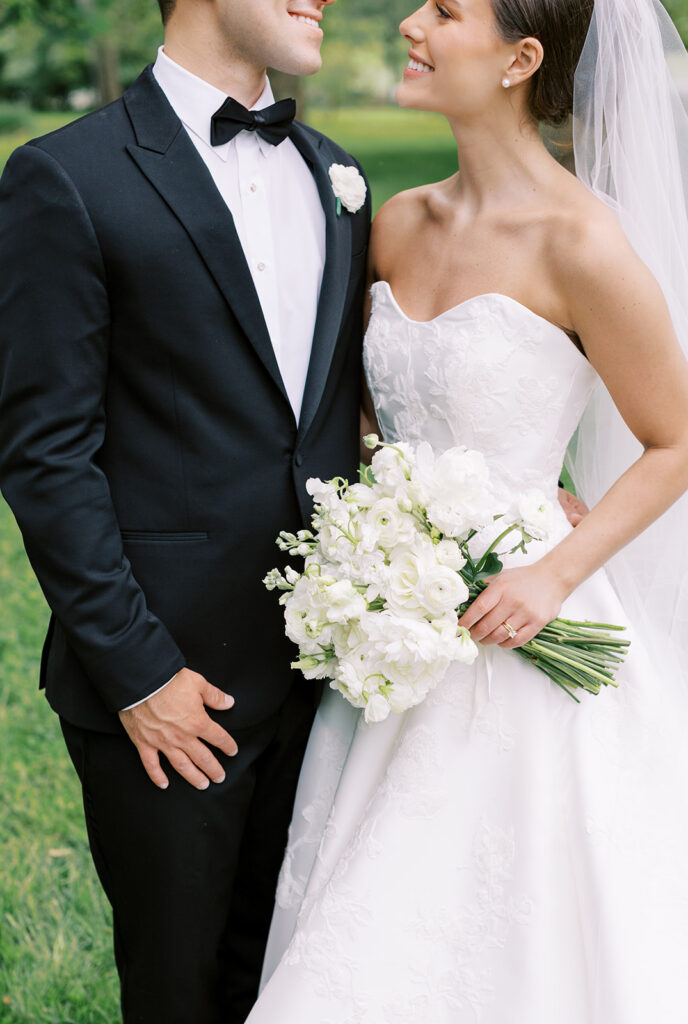 The black and white elements of the wedding party attire paired beautifully with the neutral architecture throughout the park. Madeleine’s bouquet, designed by Bloomin Buckets, featured mostly white blooms with soft greenery. The simplicity of the florals complemented the setting perfectly.